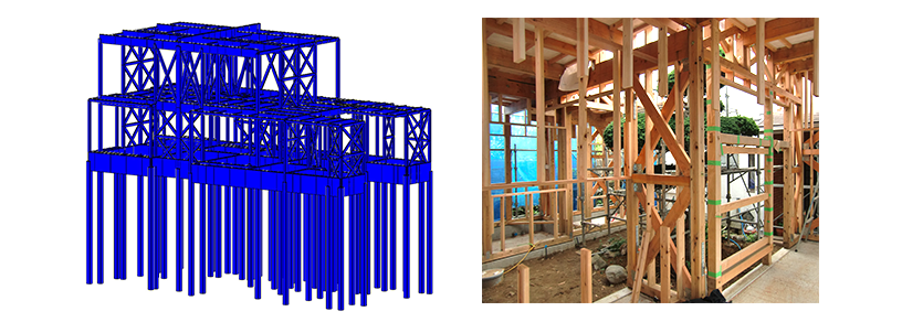 商品化された補強部材や金物や、フランチャイズ化された構法など多数ありますが、コストパフォーマンスの高い耐震強度を持たせるためには、地震に対して安全性の高い強度を計画する構造設計力が問われます。