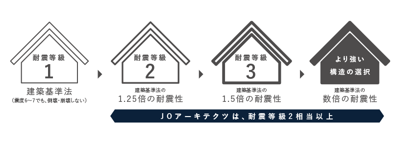 JOアーキテクツでは、より強い建物を目指したい方に等級にあらわれる基準以上の強度を構造計算により実証し、将来性の高い強い建物を目指す事が可能です。