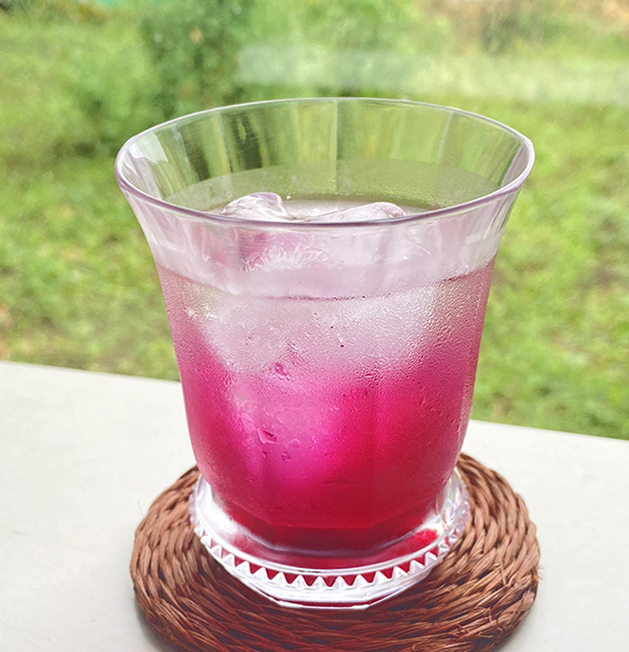 冷水や炭酸で割るときれいなマゼンタ色に。