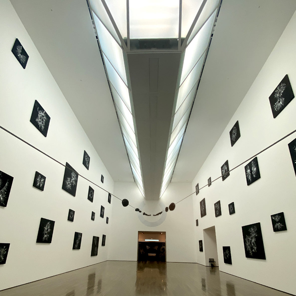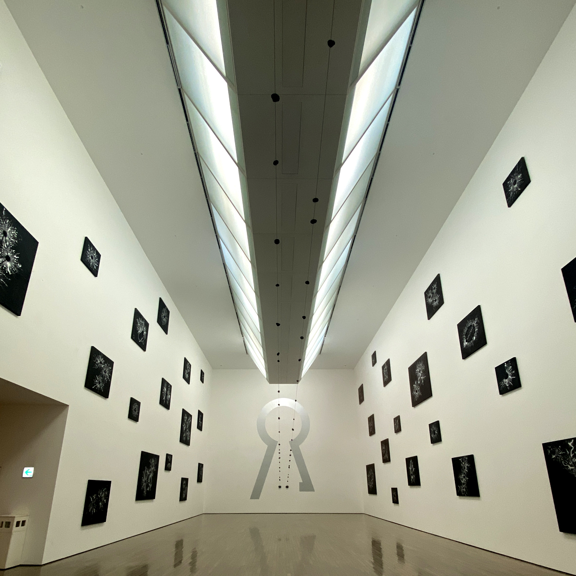 中央の鍵穴のような壁画と、ワイヤー に貫通している溶岩石のインスタレーションは、美術館近くの観音山古墳を訪れた時に着想されたそうです。